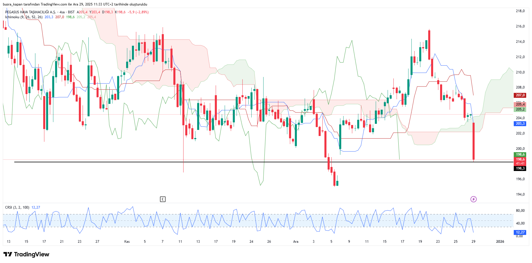 Şirketin yaptığı duyuruların ardından Pegasus hisse değerleri yaklaşık %3 düşüş yaşadı. Dünü 204,5 seviyesinde kapatan hisseler, 198,5 seviyesine kadar geriledi.